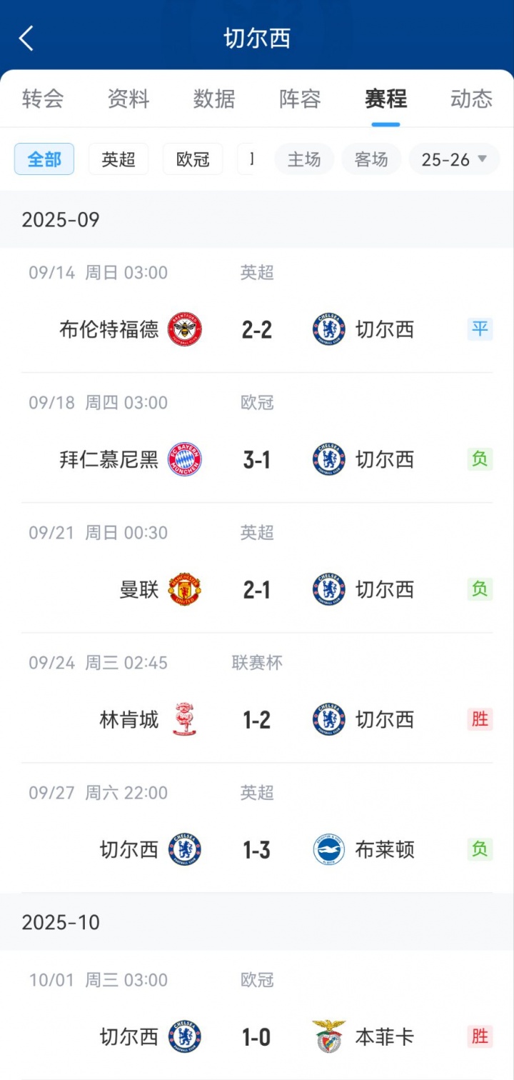 9月进行的各项赛事中,切尔西收获1胜1平3负,仅在职业联赛 杯中2-1战胜了英甲球队林肯城;他们对阵拜仁的欧冠赛事 ,对阵曼联、布莱顿的英超赛事 均不敌对手。包含周中切尔西1-0本菲卡在内的几场赛事 中,蓝军守门员桑切斯、后场球员查洛巴、前场球员佩德罗分别吃到驱逐 。