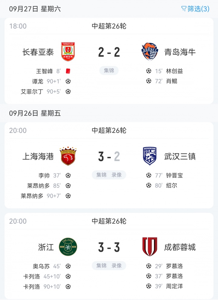 如此中超!蓉城100分钟遭绝平 海港98分钟致胜球 亚泰95分钟绝平海牛