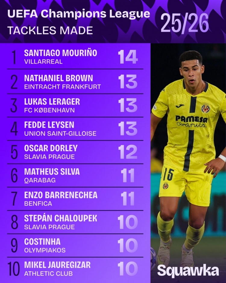 - 本赛季欧冠铲球榜:圣地亚哥-穆里尼奥14次第一,布朗等三人13次2025-11-21